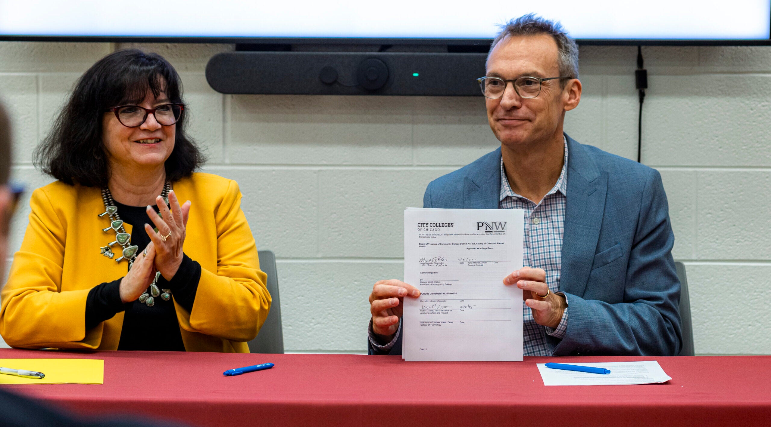 Dr. Marie T. Mora., Provost and Vice Chancellor for Academic Affairs, Purdue Univ. Northwest and Provost and Chief Academic Officer Mark Potter, City Colleges of Chicago sign an MOU that will ensure their students don’t lose credits, time, or money as they seek higher degrees in Construction Management.