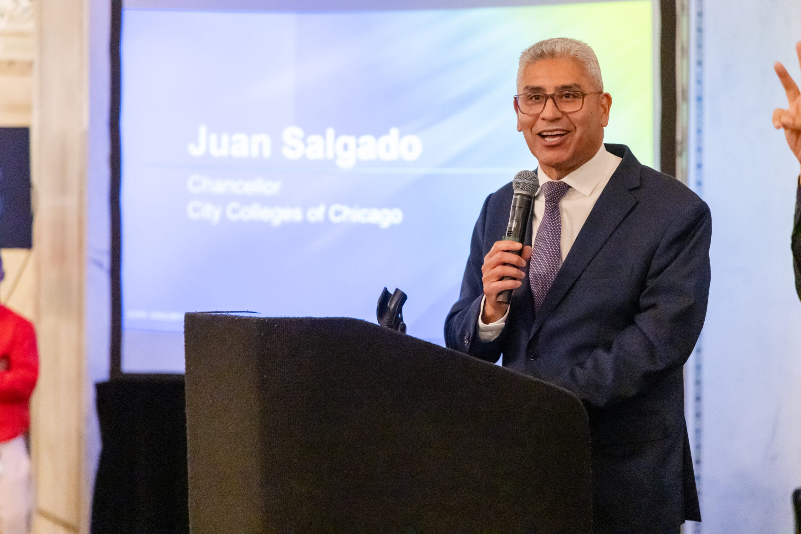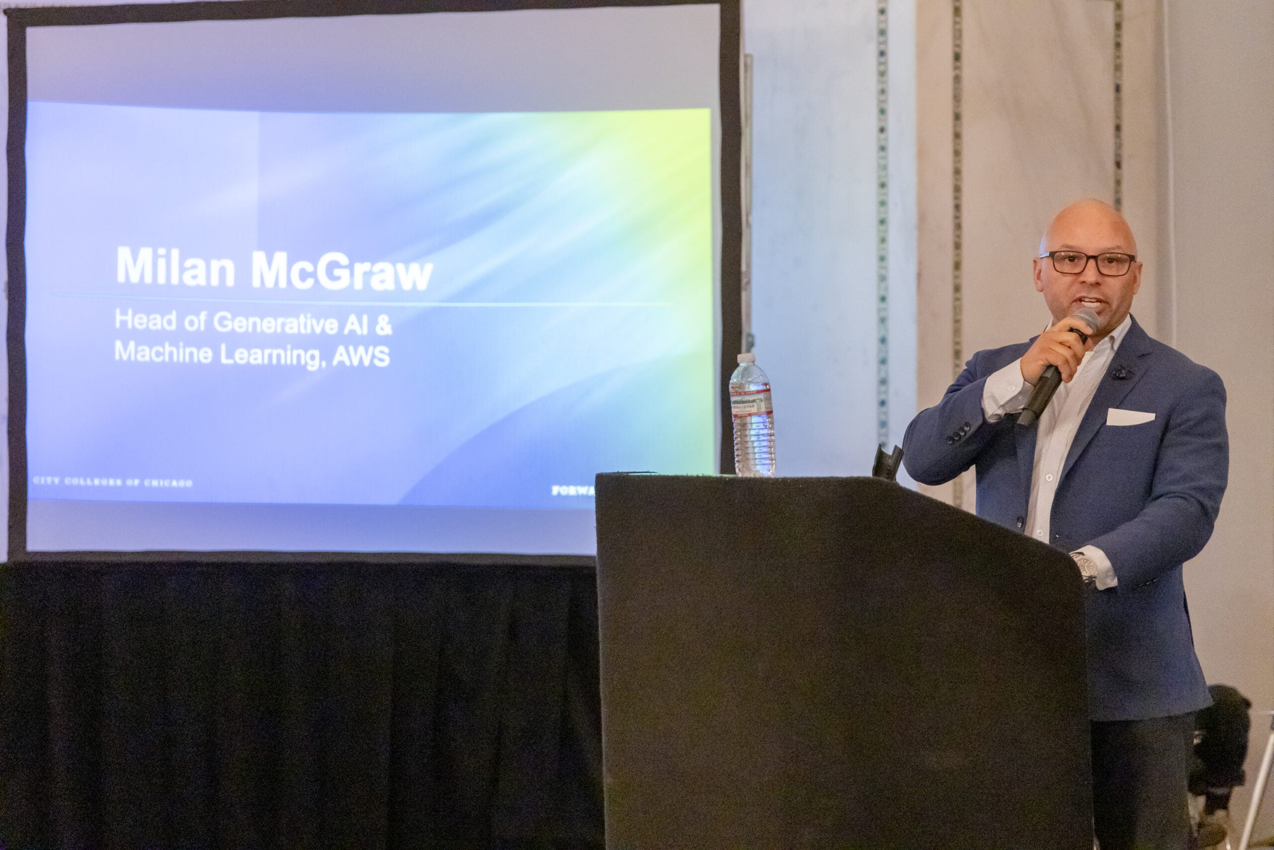 City Colleges Chancellor Juan Salgado and Executive Vice Chancellor and Chief of Staff Veronica Herrero were joined by Chicago Public Schools Chief of College and Career Success Megan Hougard, Chicago State University President Z Scott, Amazon Web Services Head of AI/ML Generative AI Milan McGraw. Two City Colleges students also shared how City Colleges supported them both in and out of the classroom as they worked toward their goals.
